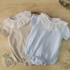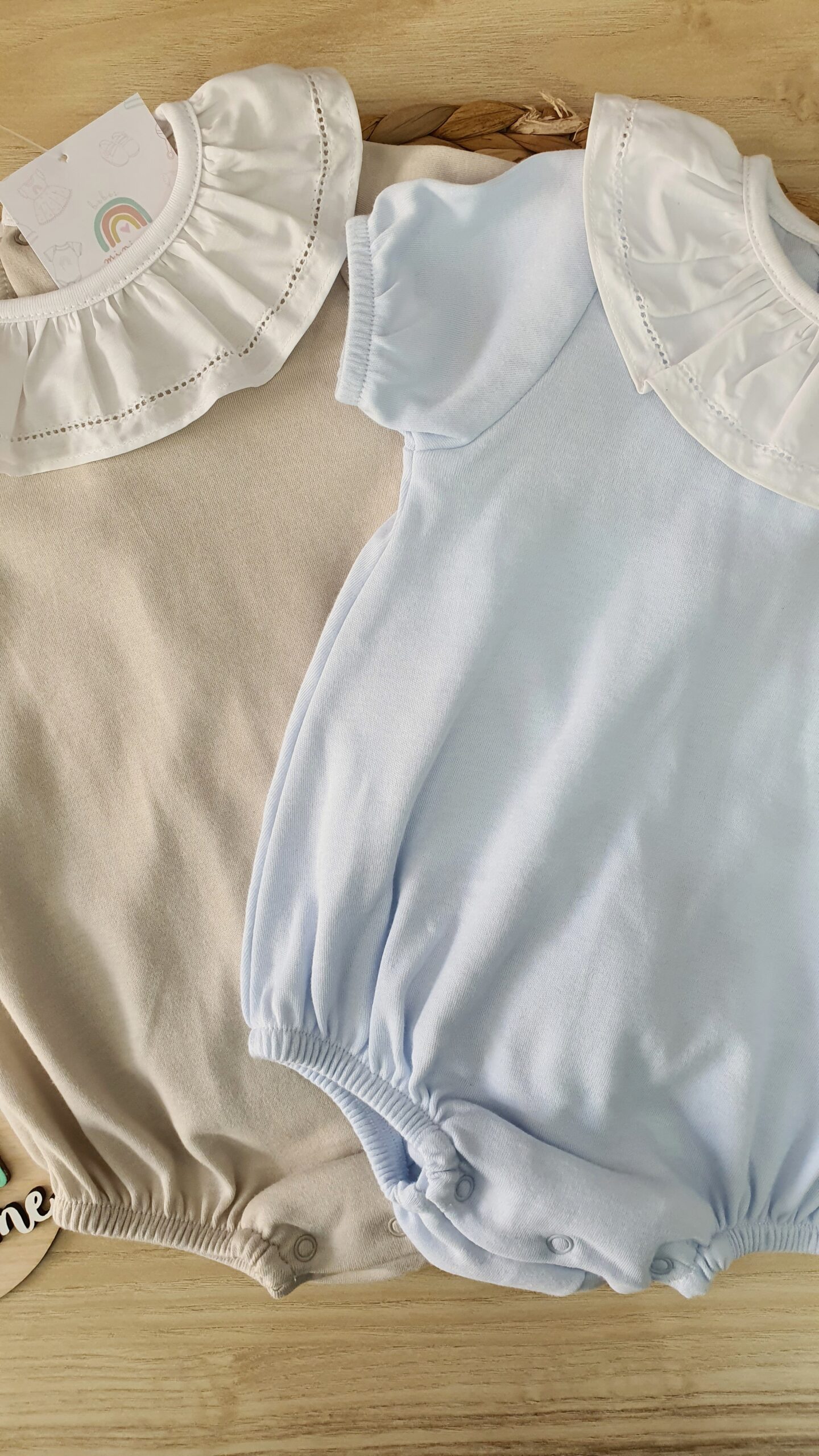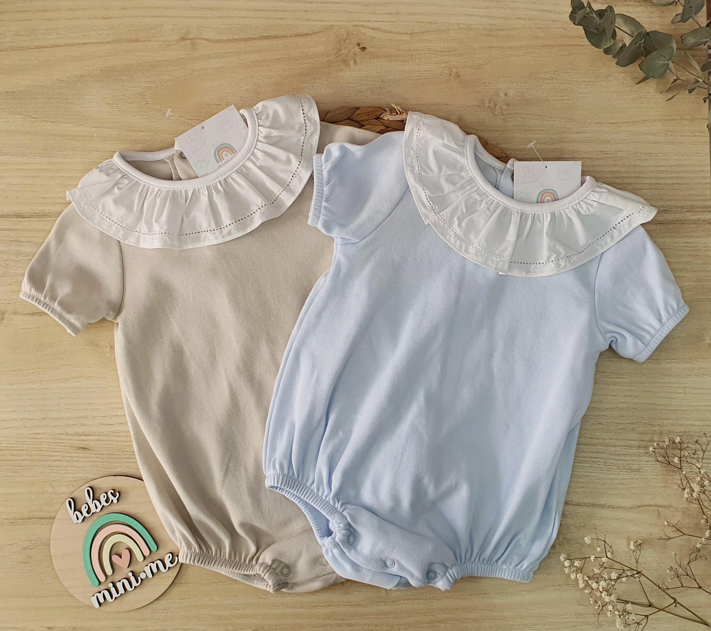 El cuello volante aporta un toque clásico y delicado, mientras que la práctica apertura de pañal facilita los cambios sin complicaciones. Disponible en dos tonos suaves y atemporales: celeste y tierra, perfectos para combinar con cualquier complemento o look.